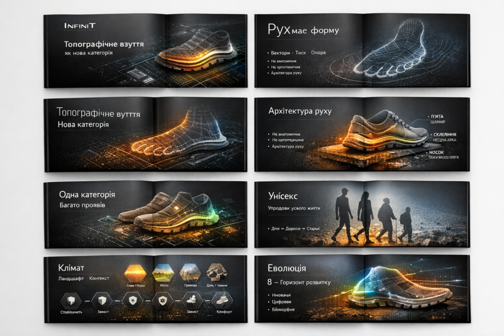 Мультифункціональне взуття трансформується і адаптується під різні потреби користувачів. Розроблено цілий модельний ряд «Інфініті» топографічного взуття для чоловіків і жінок різного віку, на всі сезони та під будь-які кліматичні умови, забезпечуючи комфорт, підтримку та унікальний дизайн.